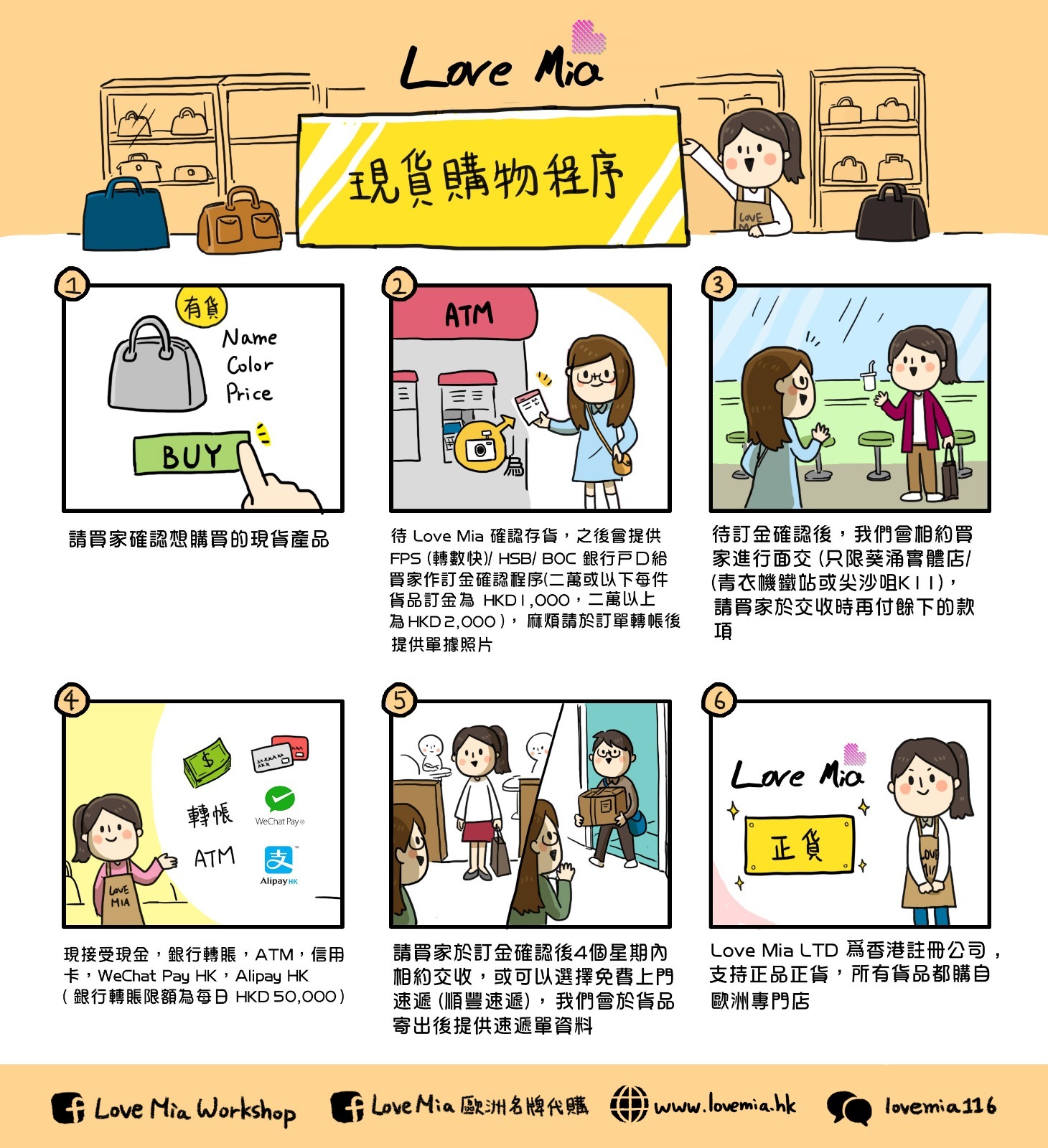 步驟 3 : 待訂金確認後,我們會相約買家進行面交 (只限Love Mia葵涌辦公室,青衣港鐵站或尖沙咀 K11 交收) ,請買家於交收時再付餘下的款項